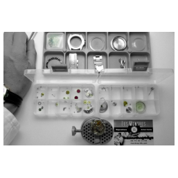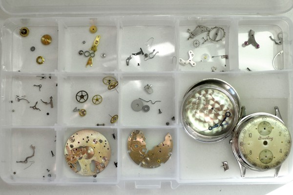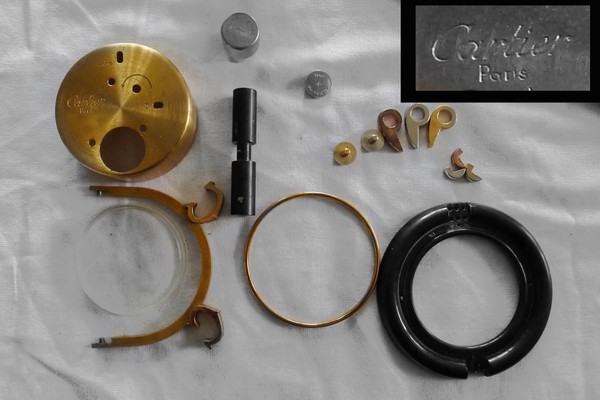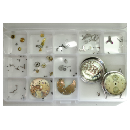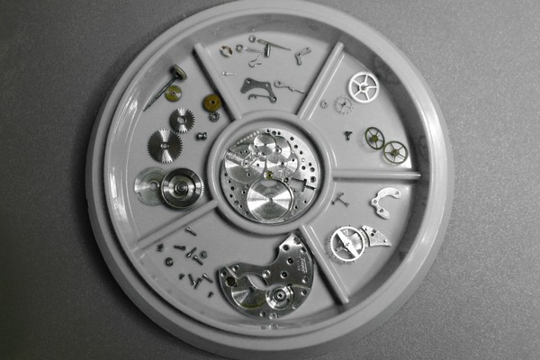 Démontage de toutes les pièces de la montre et du mouvement pour faire le nettoyage.